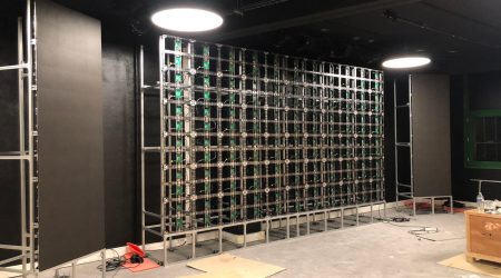 La solution que nous avons choisie était un écran intérieur standard géant de 5 mLx3MH P1.87 + 2 écrans totémiques de 0,5 m L x 3 m H et une colonne LED P2,5 supplémentaire de 1,5 m H x 1,2 m de diamètre utilisant un écran LED flexible.